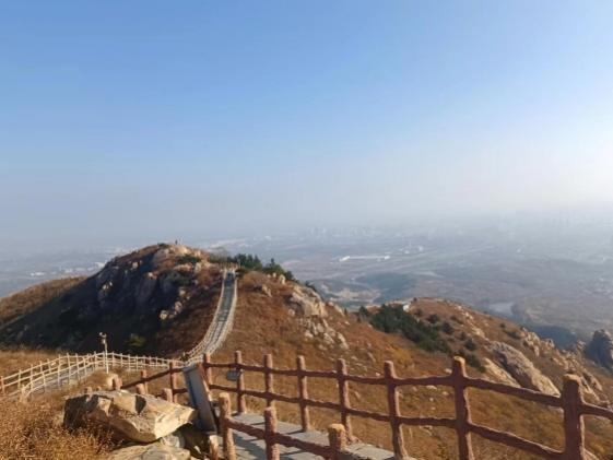 磁山海拔雖不算高,但氣勢美景絲毫不遜色。登至山頂,放眼眺望,秋色盡收眼底,頭頂是天空那純凈的藍色,周圍城市全景盡收眼底,高樓鱗次櫛比,道路縱橫交錯,綠毯似的田園溝壑和炊煙裊裊的村莊都披上了一層銀紗,一切都在腳下。大家都深深陶醉于眼前的美景,看著這萬千景象,心中頓然升起一種“會當凌絕頂,一覽眾山小”的豪氣。